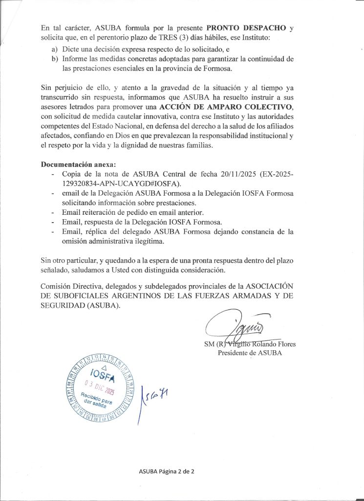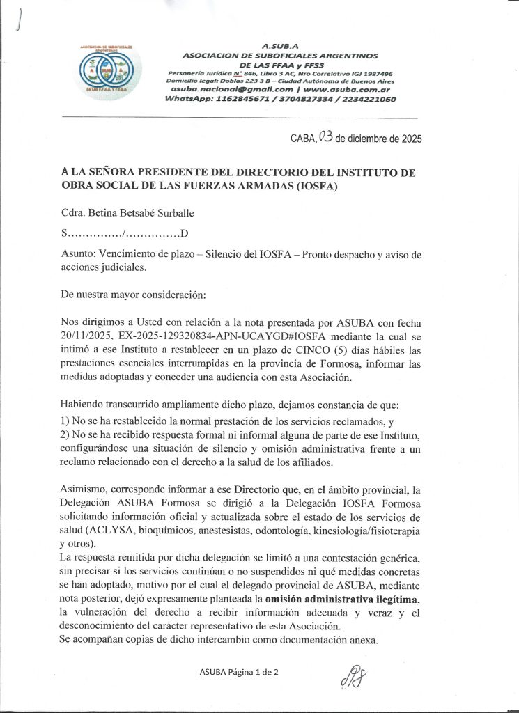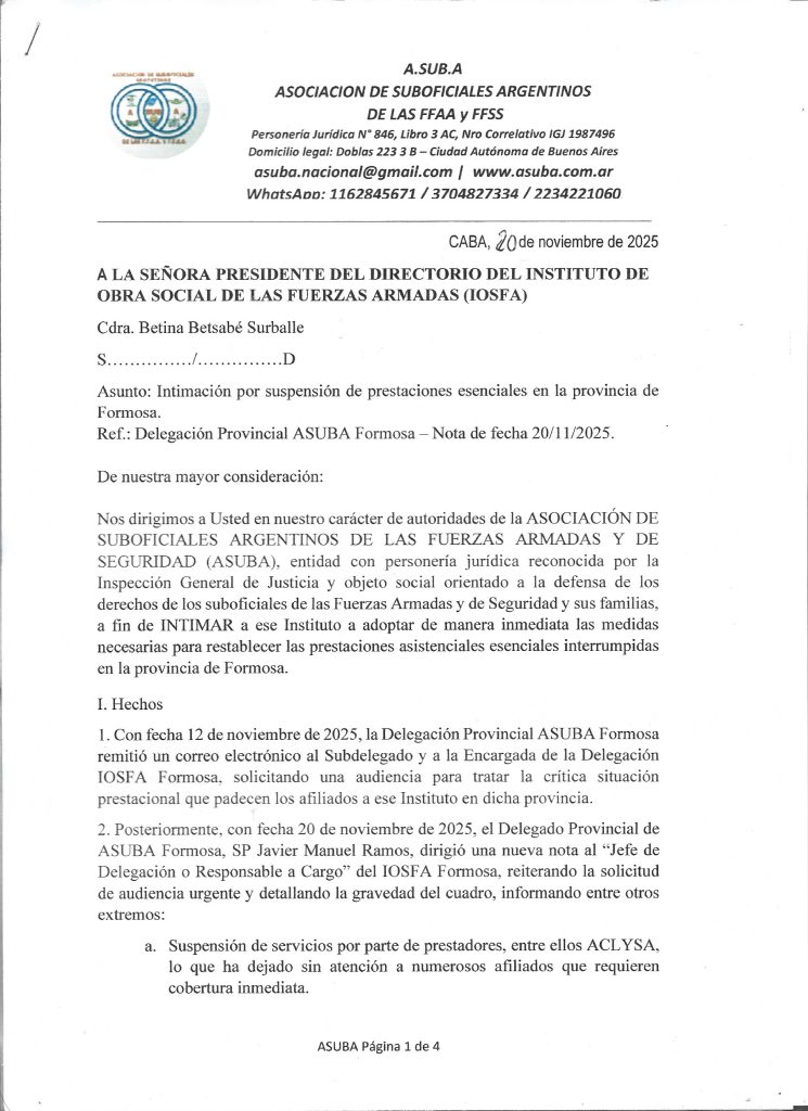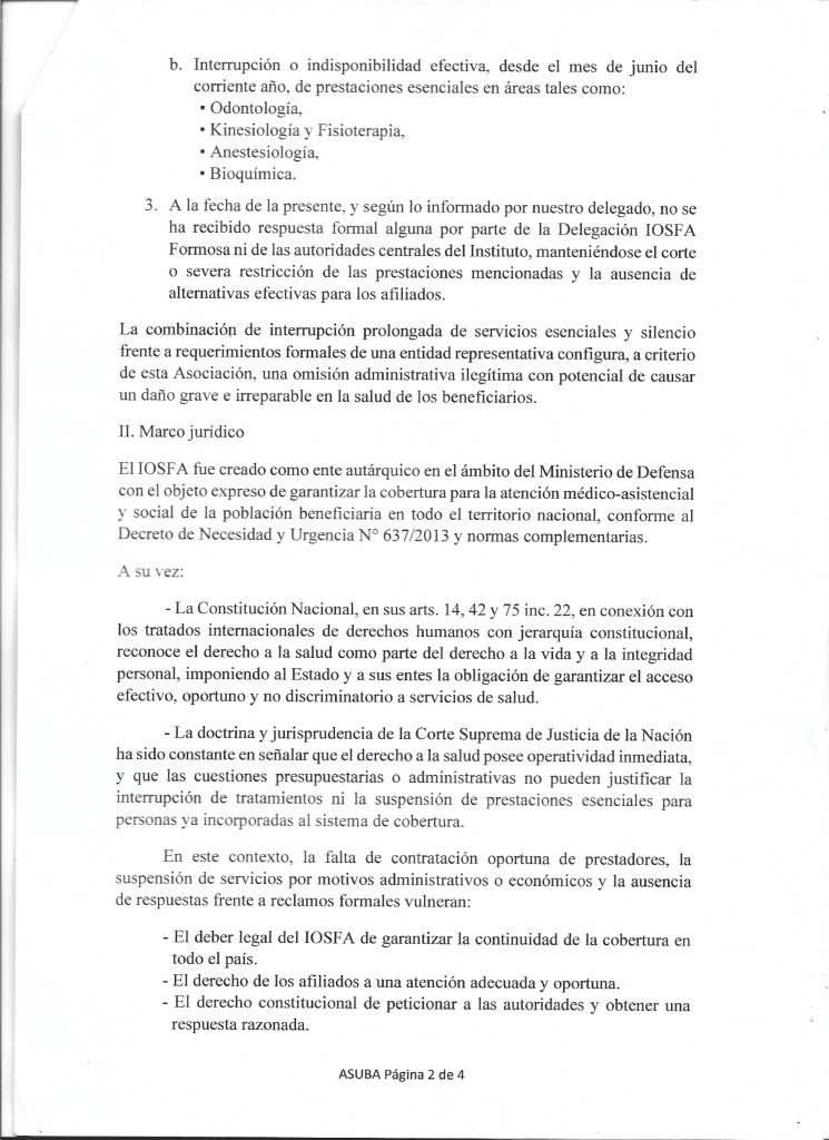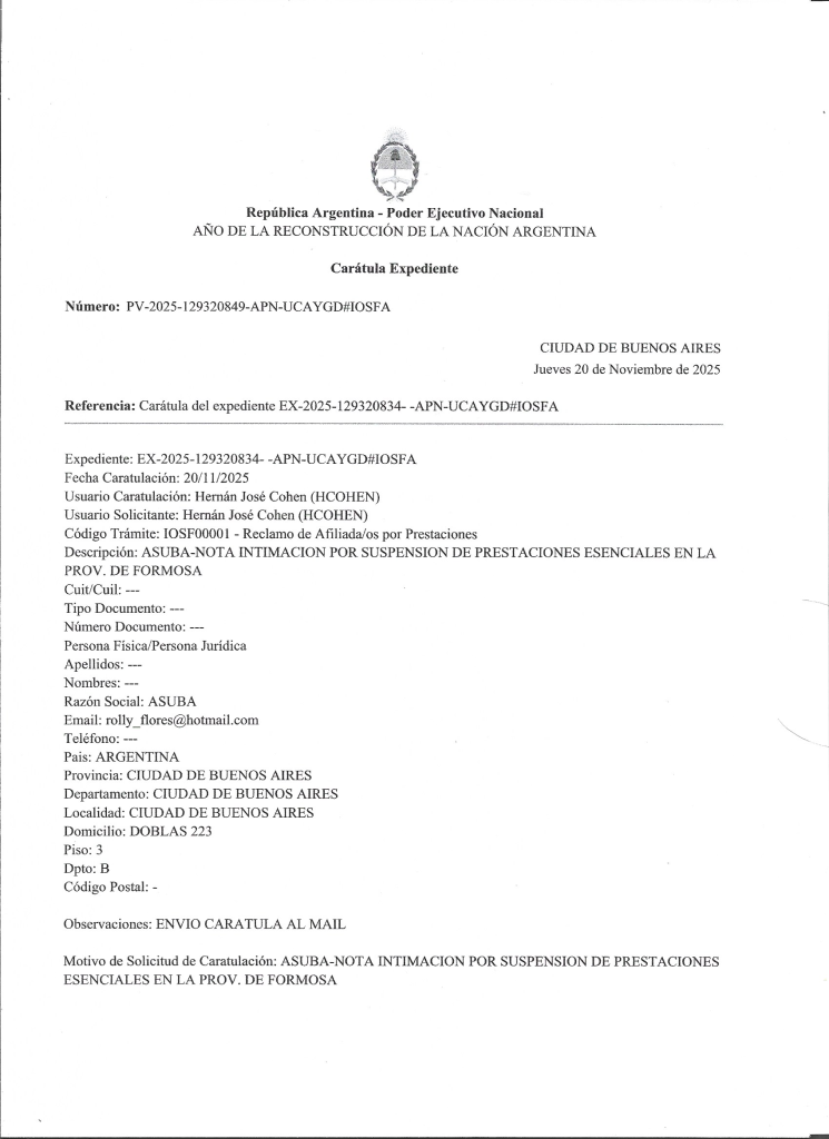Reunión de ASUBA con abogados representantes de Defensoría del Pueblo de Formosa, presentación reclamo por suspensión de servicios médicos 11:50 hs hasta las 13:00 hs – 3 de noviembre 2025